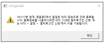 "동일 ID의 접속으로 인해 종료합니다."라는 다음과 같은 팝업창이 나옵니다.