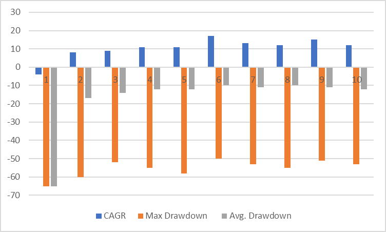 GP/A가 높을수록 CAGR이 높고 MDD가 낮은 경향을 보임