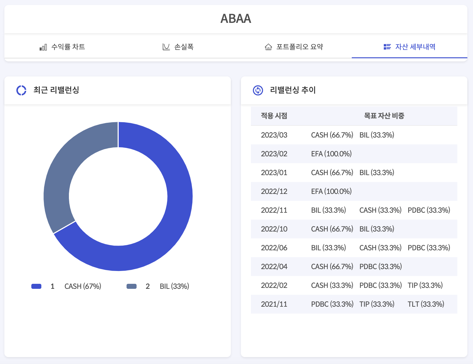 (스노우볼72의 결과에서 cash와 BIL을 구분했는데, 저는 BIL을 현금과 동일하게 생각하고 만들었습니다. 운영할때도 BIL이 나오면 현금에 배분합니다.)