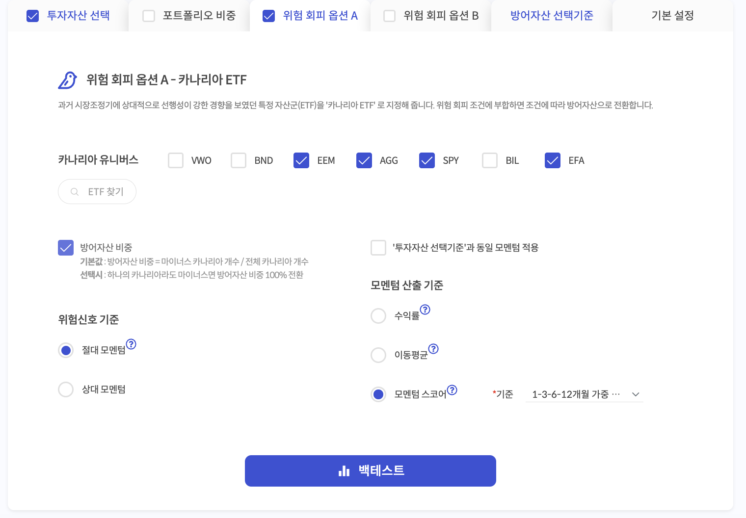 - 카나리아 자산의 1-3-6-12 모멘텀 점수 중 하나라도 0이하 있으면 안전형, 모두 0이상이면 공격형