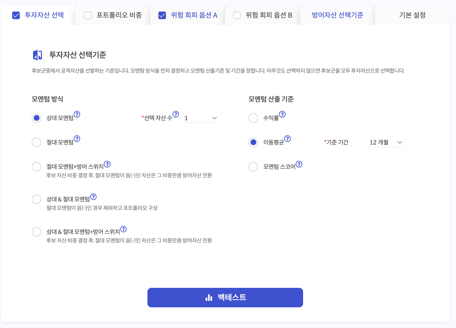 - 12개월 단순 이동평균을 구해서 가장 높은 1가지 자산에 투자
