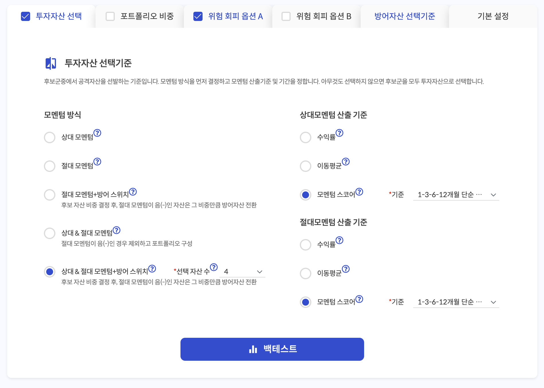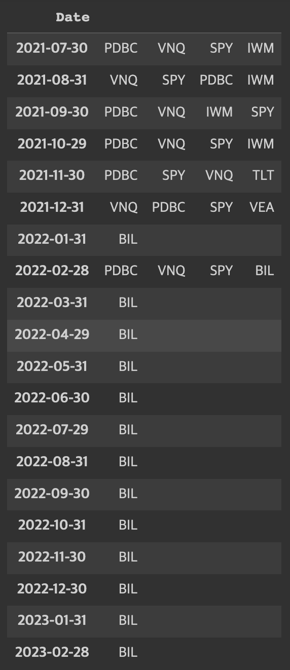- 1-3-6-12 모멘텀 점수가 가장 큰 4가지 자산에 투자하지만 값이 음수이면 BIL로