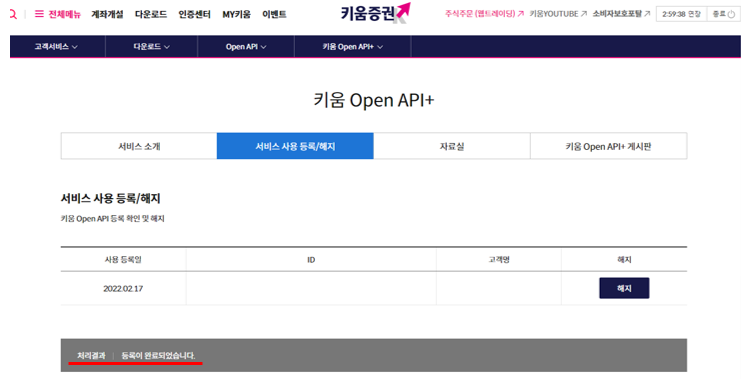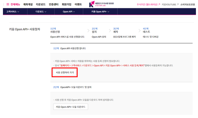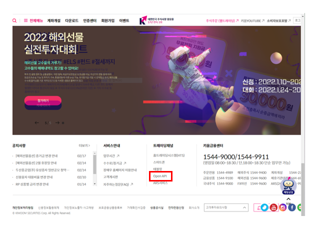 - 홈페이지 하단 '트레이딩체널' > 'Open API' 클릭